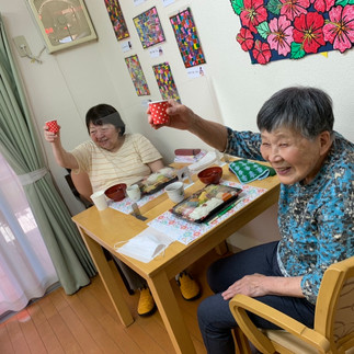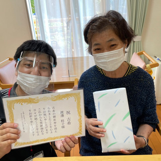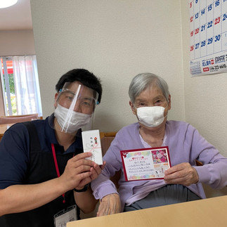 また、皆様には各担当職員が書いたメッセージカードと紅白饅頭をプレゼントしました。「ありがとうございます」と皆様の素敵な笑顔を見る事が出来ました。後日、紅白饅頭を食べられたご利用者様から「あんこがいっぱい入ってとても美味しかったよ~」とお話して下さいました。